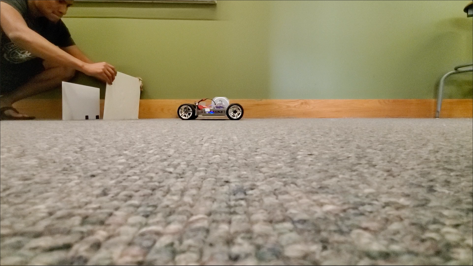 Taking the Matlab compensator design, I created a true PD controller through the use of a potentiometer and capacitor. As a result, my system had a maximum overshoot of 17.4%, a 4.76-second settling time, and maintained a distance of 8.625 inches away from the lead vehicle.